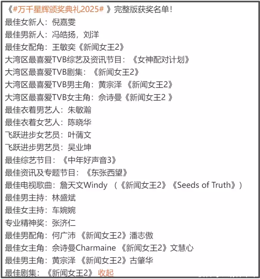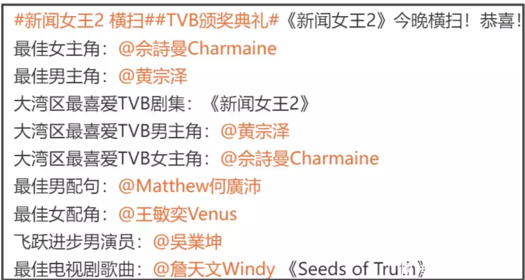 ——开个玩笑,前排恭喜TVB新晋视后佘诗曼、视帝黄宗泽。